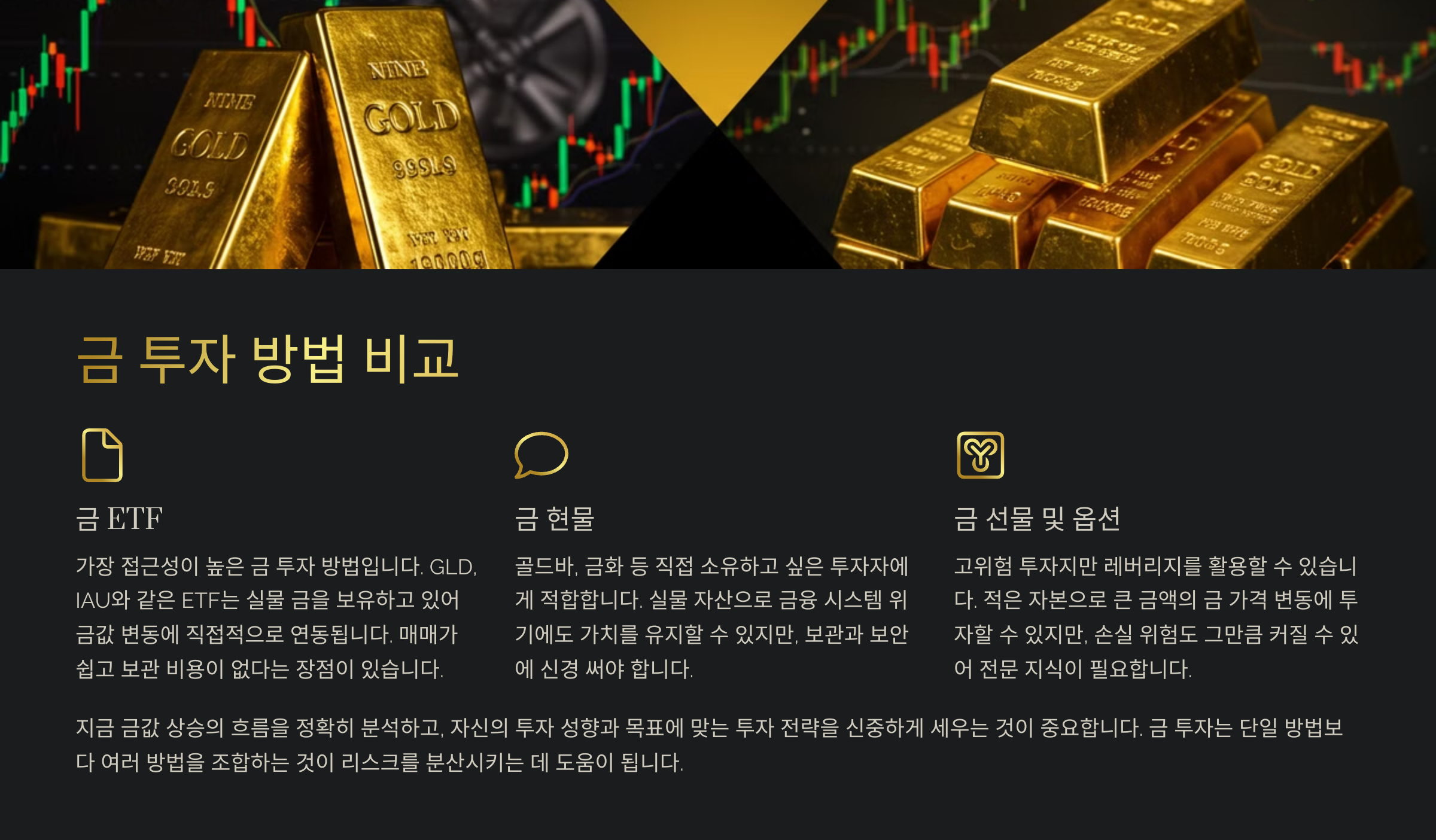 ✔ 금 ETF, 현물 금, 금 선물 등 투자 방식에 따라 리스크를 다르게 조절 가능