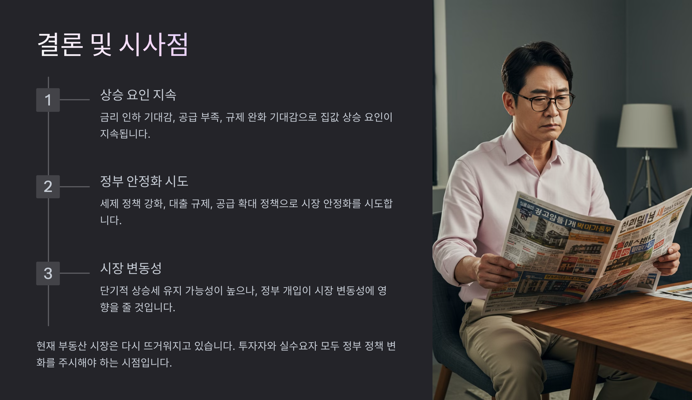 - 주택 공급 확대 정책이 실효성을 갖추면 장기적으로 가격 안정화에 기여할 수 있음.