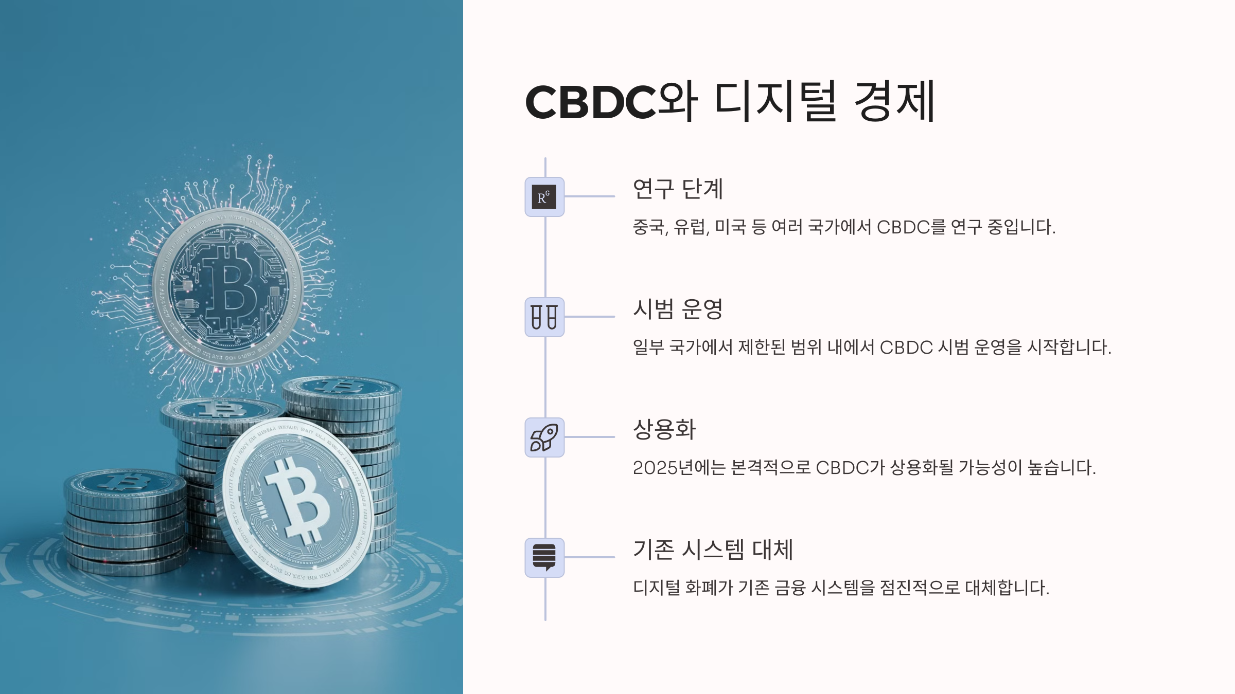 CBDC는 현재 중국, 유럽, 미국 등 여러 국가에서 연구 중이며, 2025년에는 본격적으로 상용화될 가능성이 높습니다.