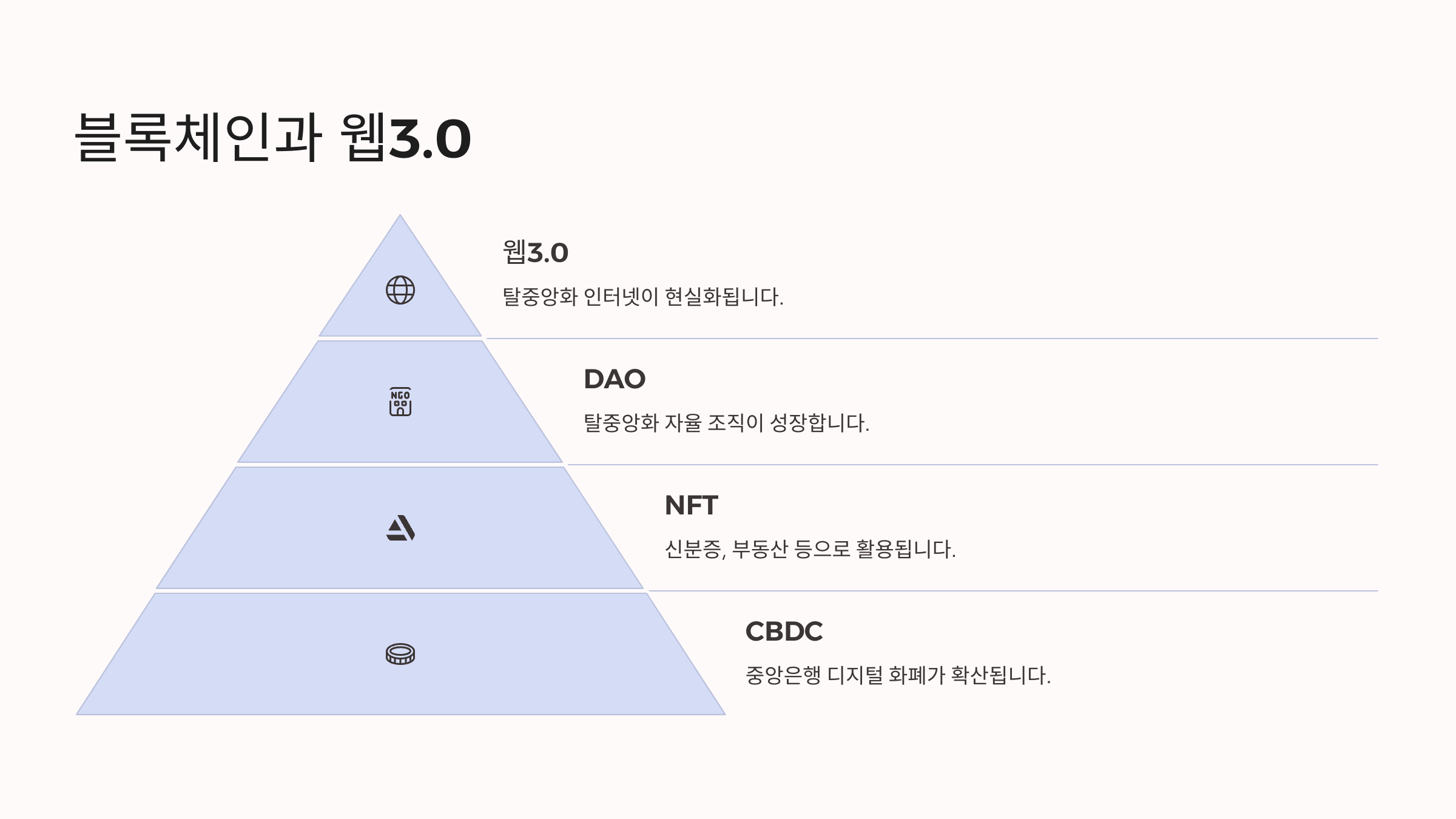 - 기존의 중앙 집중형 인터넷에서 벗어나, 사용자가 직접 데이터를 소유하고 관리하는 구조