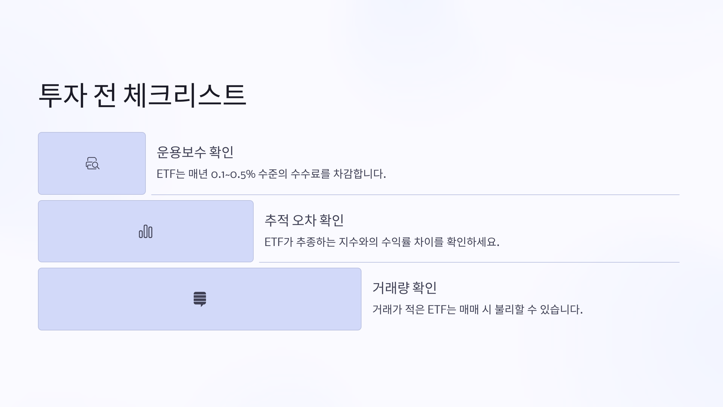 ETF는 분산 투자에 유리하지만, ‘무조건 안전하다’는 것은 아닙니다. 다음의 포인트를 기억해두세요.