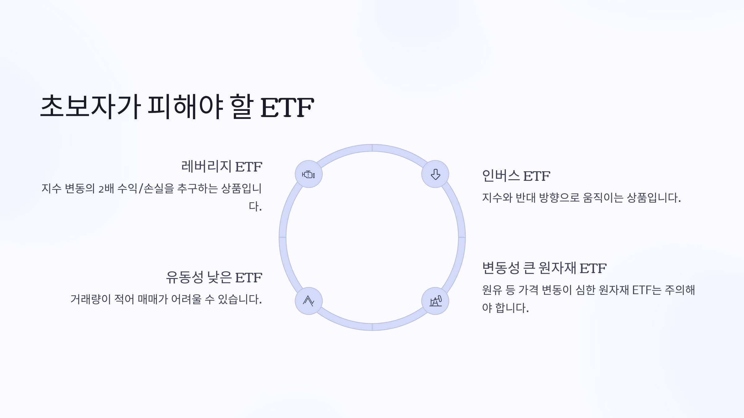 → 거래가 너무 적은 ETF는 매매 시 가격이 불리할 수 있습니다. - 레버리지/인버스 ETF는 초보자에게 비추